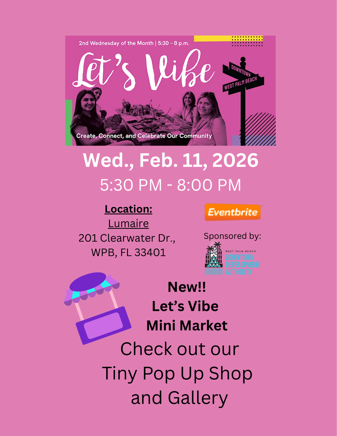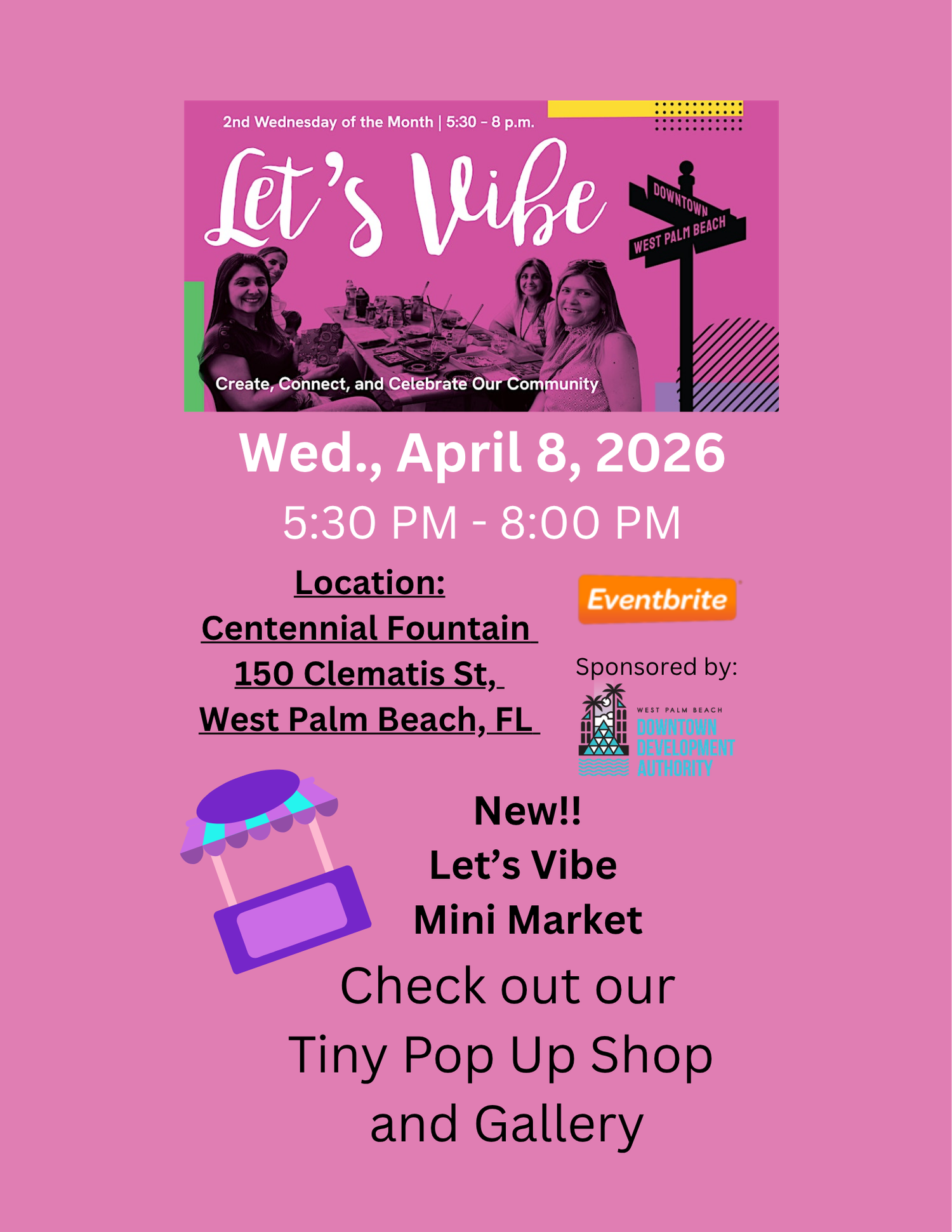 Join us every second Wednesday of the month for Let’s Vibe, a fun and creative way to experience Downtown West Palm Beach. Discover new bites, meet your neighbors, explore local vendors, and enjoy creative workshops. Each month brings a new location, a new vibe, and something fresh to try.