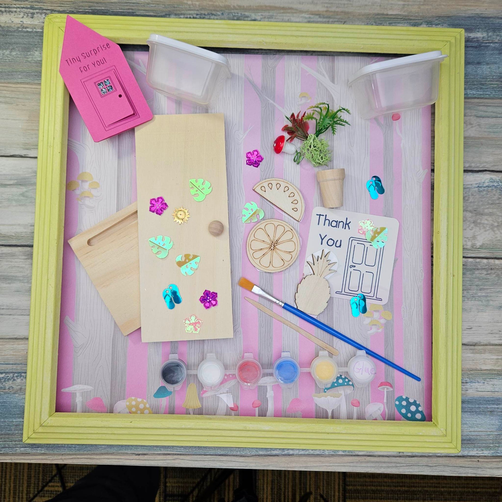 Wooden Tiny Door, Tiny Front Porch, Tiny Paint, Tiny Paint Brush, Tiny Wood Pieces, Tiny Door Knob, Tiny Plant Kit with Tiny Pot, Tiny Embellishment, Tiny Glue Jar all packaged in a Tiny Gift Box that can be used as a tiny storage box.